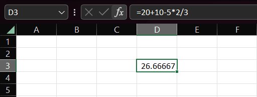 First off, we put an equals sign (=) at the start of every formula. Then I have told the formula to add 20 and 10 together. After that, the formula will take 5 away from the total, multiply it by 2 and then divide it by 3.